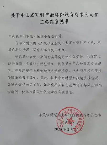 中山市威可利节能环保设备有限公司是国家高新技术企业、广东省高薪企业、中山市规上企业,自新冠肺炎疫情发生以来,中山市威可利节能环保设备有限公司高度重视,为全体员工购买了50万元的病疫医疗险,并严格落实防控工作,排摸人员信息,筹集防护物资,制定应急预案,细化防控方案。近日获得政府审核批准复工。